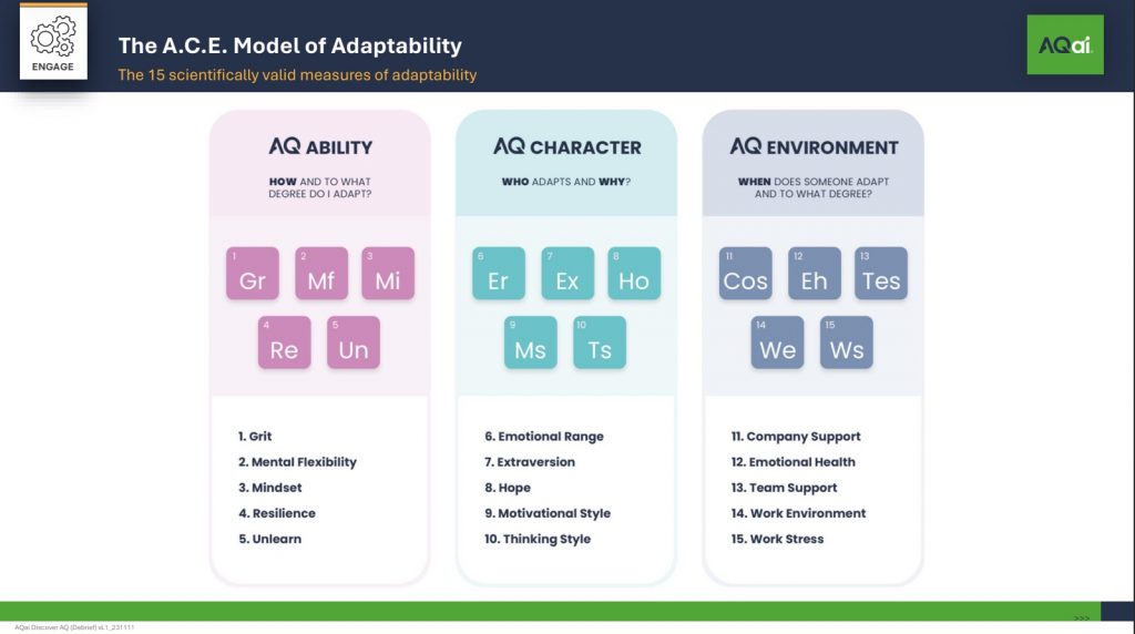 AQai – a powerful, new profiling tool for individuals, teams and organisations which provides a comprehensive report on abilities, character and the working environment – all key, connected elements for managing and adapting to continuous change and transformation.